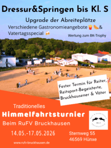Auch findet in diesem Jahr wieder der „Große Preis von Bruckhausen“ statt, eine Springprfg Kl. S** mit zusätzlicher Wertung zum BK Trophy Sponsered by @stresan_kirchhellenersand & @berndsreitbodensysteme